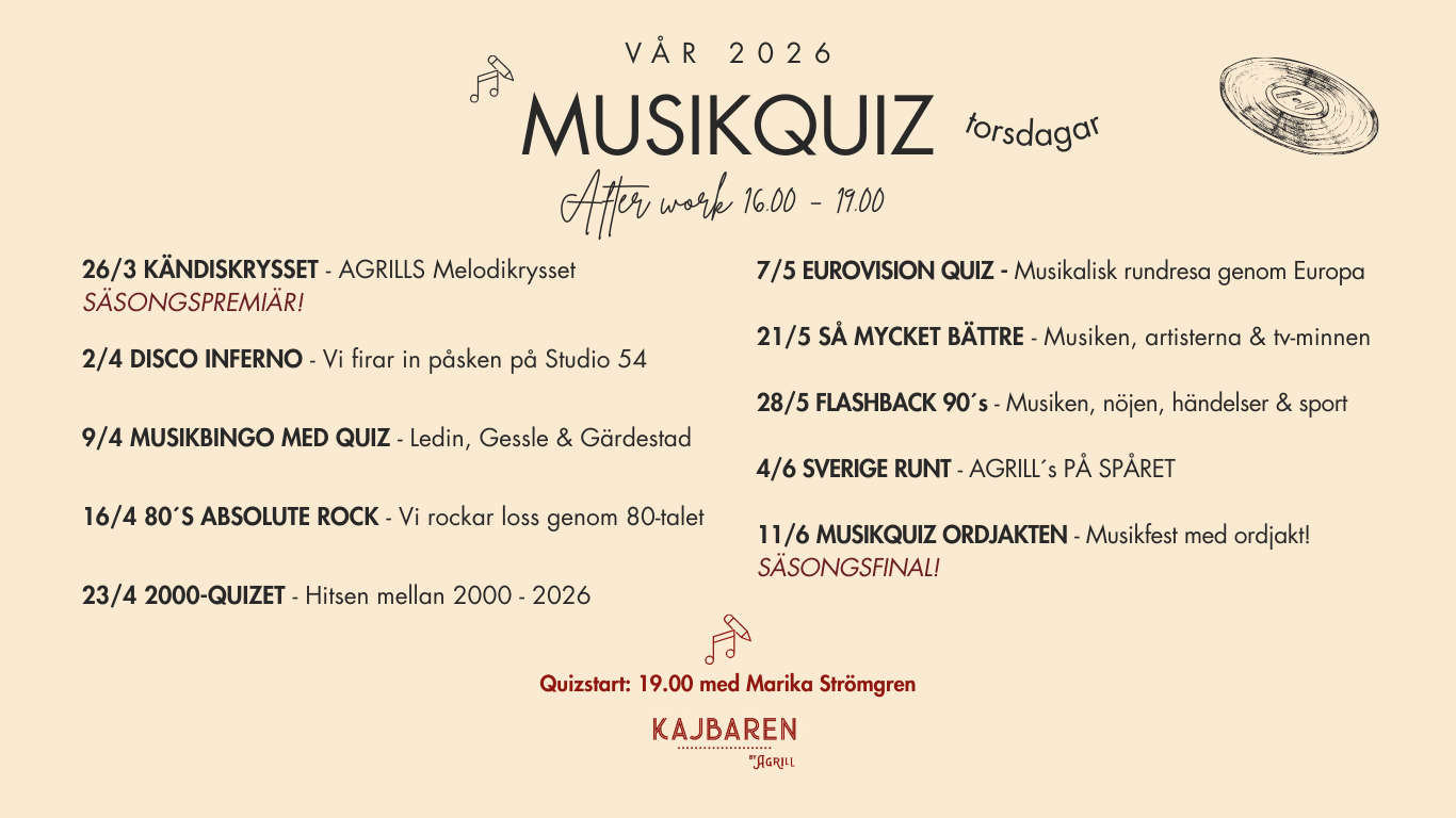 ÖPPNAR ÅTER TORSDAG 26 MARS 2026 MED PREMIÄR FÖR MUSIKQUIZ!
